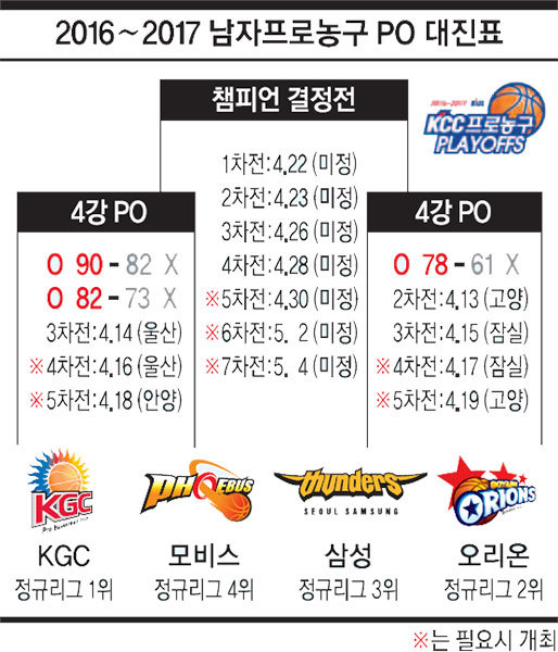 KBL 역대 4강 플레이오프(PO·5전3승제)에서 1·2차전을 모두 잡은 팀이 챔피언 결정전(7전4승제)에 오른 확률은 100%였다. 이를 재현하려는 정규리그 1위 KGC와 저지하려는 4위 모비스가 12일 안양체육관에서 ‘2016∼2017 KCC 프로농구’ 4강 PO 2차전을 펼쳤다.