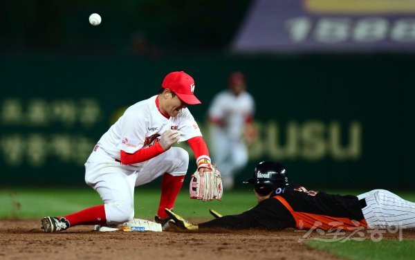 12일 인천 SK행복드림구장에서 ‘2017 타이어뱅크 KBO리그’ SK 와이번스와 롯데 자이언츠의 경기가 열렸다. 연장 10회초 무사 1루에서 롯데 손아섭 타석 때 1루주자 오승택이 2루 도루에 성공하고 있다.