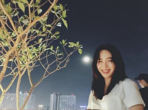 게시물 속 민아는 달빛아래 서서 카메라를 향해 환한 미소를 짓고 있는 모습, 수영복을 입고 누군가와 함께 물놀이 중 사진을 찍은 모습이다.