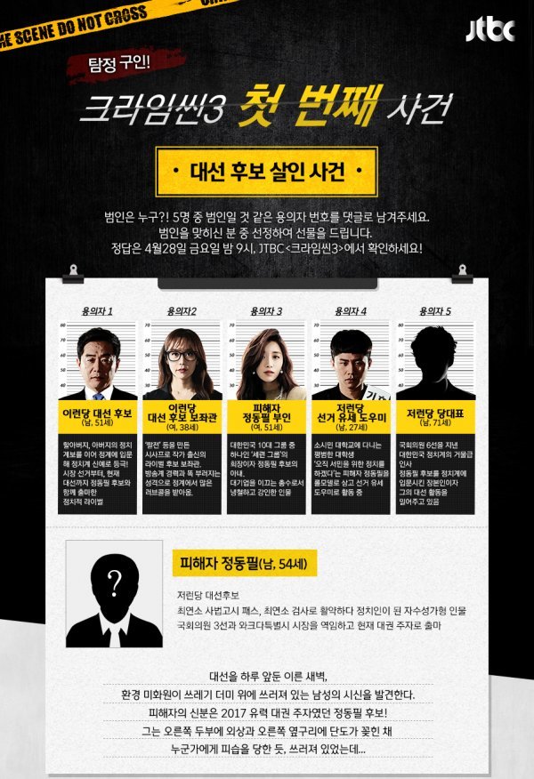 ‘크라임씬3’ 공식 홈페이지에서는 용의자 5명 중 범인일 것 같은 용의자를 맞히는 이벤트를 진행하고 있다.