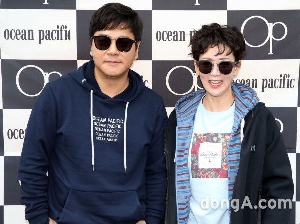 배우 김형종(왼쪽)과 이상아가 14일 오후 서울 마포구 미스트랄 홍대점에서 열린 오션퍼시픽 론칭 행사에 참석해 포토타임을 하고 있다.