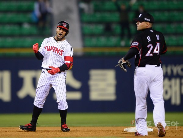 14일 잠실야구장에서 ‘2017 타이어뱅크 KBO 리그’ LG트윈스와 kt위즈의 경기가 열렸다. 6회말 1사 만루에서 LG 히메네스가 싹쓸이 3타점 2루타를 치고 포효하고 있다.