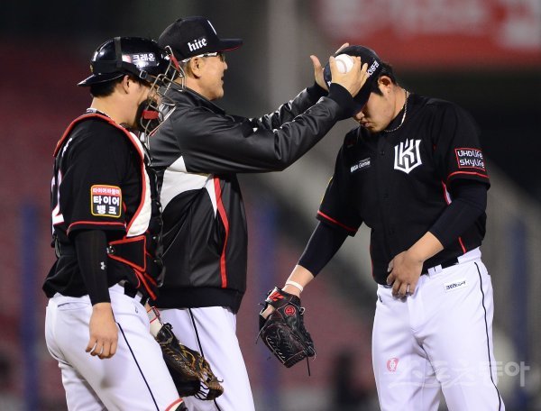 14일 잠실야구장에서 ‘2017 타이어뱅크 KBO 리그’ LG트윈스와 kt위즈의 경기가 열렸다. kt 선발 정대현이 6회말 1사 만루에서 LG 히메네스에게 싹쓸이 3타점 2루타를 허용한 후 정명원 투수코치(가운데)의 위로를 받고 있다.