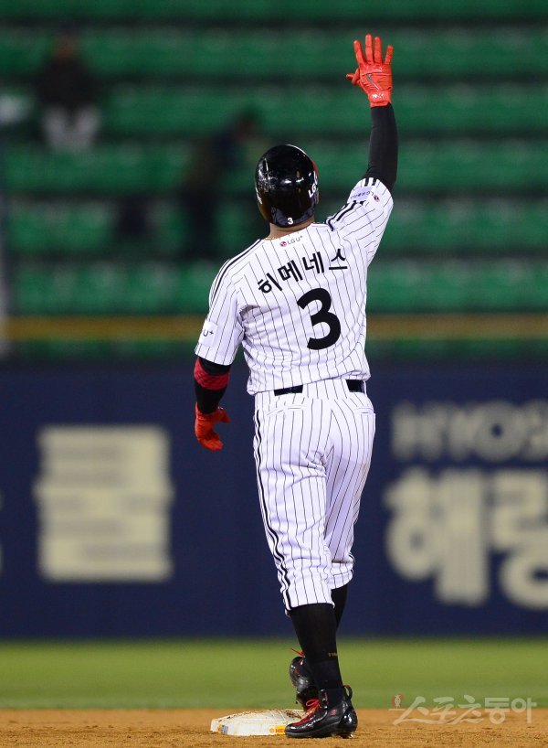 14일 잠실야구장에서 ‘2017 타이어뱅크 KBO 리그’ LG트윈스와 kt위즈의 경기가 열렸다. 6회말 1사 만루에서 LG 히메네스가 싹쓸이 3타점 2루타를 치고 세리머니를 하고 있다.