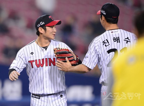 14일 잠실야구장에서 ‘2017 타이어뱅크 KBO 리그’ LG트윈스와 kt위즈의 경기가 열렸다. LG 오지환이 8회초 이닝을 무실점으로 막은 진해수(오른쪽)와 기쁨을 나누고 있다.