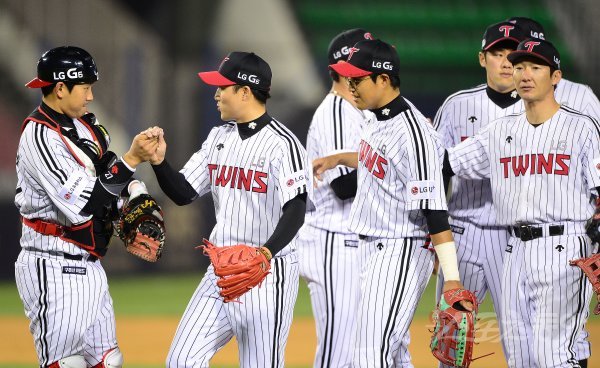 14일 잠실야구장에서 열린 ‘2017 타이어뱅크 KBO 리그’ LG트윈스와 kt위즈의 경기에서 LG가 5-2로 승리하며 5연패에서 탈출했다. 경기 후 LG 선수들이 기쁨을 나누고 있다.