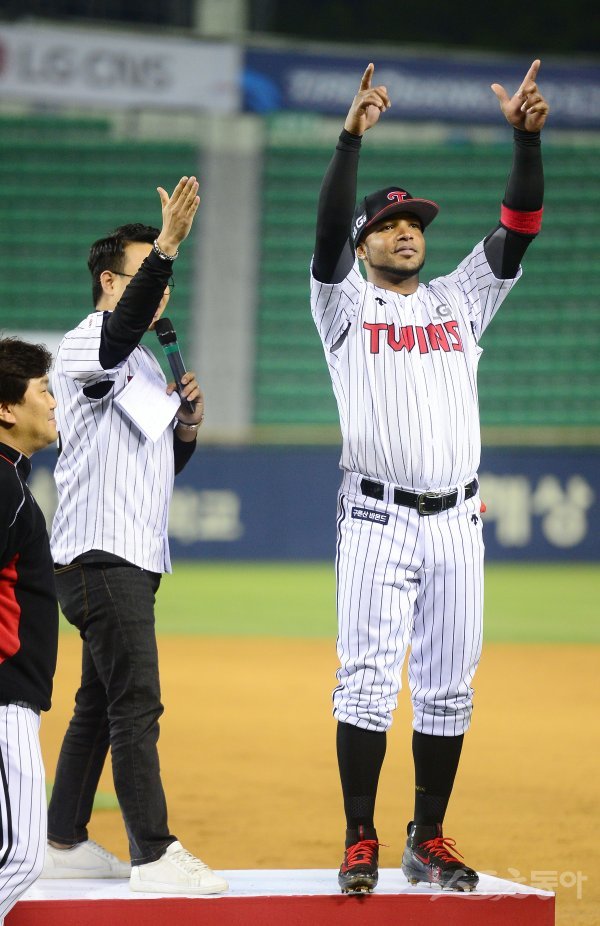 14일 잠실야구장에서 열린 ‘2017 타이어뱅크 KBO 리그’ LG트윈스와 kt위즈의 경기에서 LG가 5-2로 승리하며 5연패에서 탈출했다. 경기 후 LG 히메네스가 수훈선수 인터뷰 중 팬들을 향해 포즈를 취하고 있다.