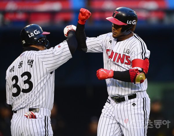 14일 잠실야구장에서 ‘2017 타이어뱅크 KBO 리그’ LG트윈스와 kt위즈의 경기가 열렸다. 1회말 2사 2루에서 LG 히메네스가 kt 선발 정대현을 투런홈런을 친 후 홈에서 박용택과 기쁨을 나누고 있다. 잠실 | 김진환 기자 kwangshin00@donga.com