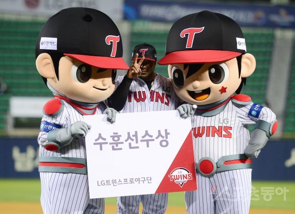 14일 잠실야구장에서 열린 ‘2017 타이어뱅크 KBO 리그’ LG트윈스와 kt위즈의 경기에서 LG가 5-2로 승리하며 5연패에서 탈출했다. 경기 후 LG 히메네스가 수훈선수 시상 중 익살스러운 포즈를 취하고 있다. 잠실 | 김진환 기자 kwangshin00@donga.com