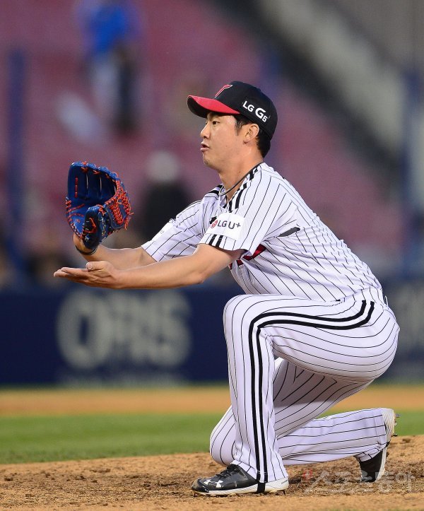 15일 잠실야구장에서 ‘2017 타이어뱅크 KBO 리그’ LG트윈스와 kt위즈의 경기가 열렸다. 8회초 2사 LG 네 번째 투수 진해수가 kt 전민수의 투수 앞 땅볼을 잡아내고 있다.