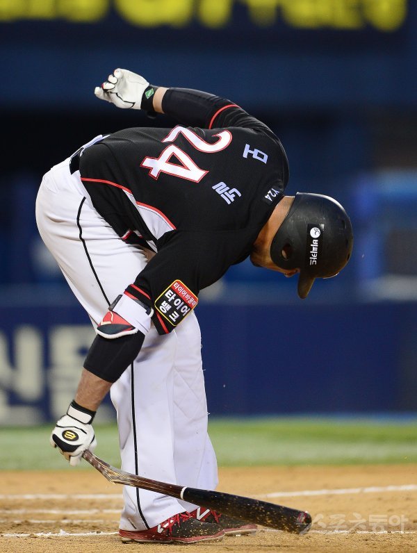 15일 잠실야구장에서 ‘2017 타이어뱅크 KBO 리그’ LG트윈스와 kt위즈의 경기가 열렸다. 9회초 선두타자로 나온 kt 모넬이 1루수 정면 타구로 아웃 당하자 방망이를 땅에 내려치고 있다.