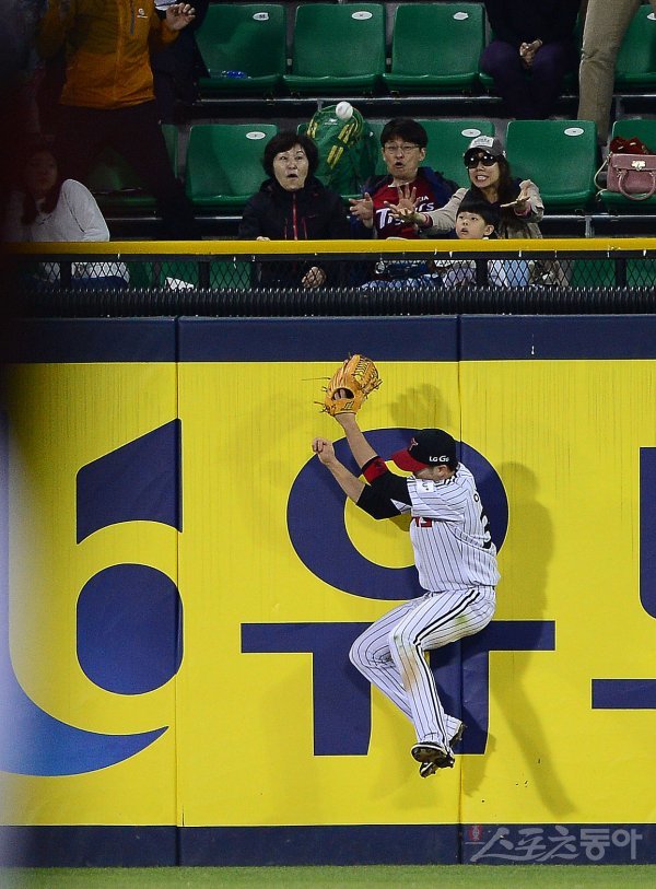15일 잠실야구장에서 ‘2017 타이어뱅크 KBO 리그’ LG트윈스와 kt위즈의 경기가 열렸다. 9회초 2사 LG 중견수 이형종이 kt 유한준의 타구를 잡기 위해 점프를 하고 있다. 비디오 판독 끝에 2루타로 인정됐다.