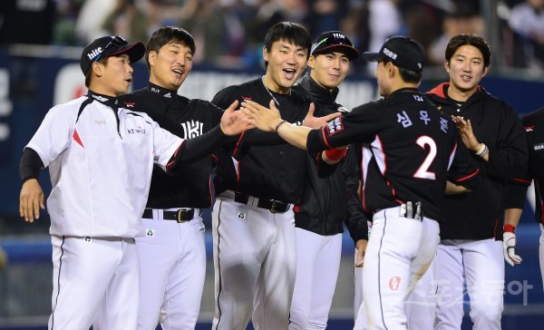 15일 잠실야구장에서 열린 ‘2017 타이어뱅크 KBO 리그’ LG트윈스와 kt위즈의 경기에서 연장 접전 끝에 kt가 1-0 승리를 거뒀다. 경기 후 kt 선수들이 기쁨을 나누고 있다.
