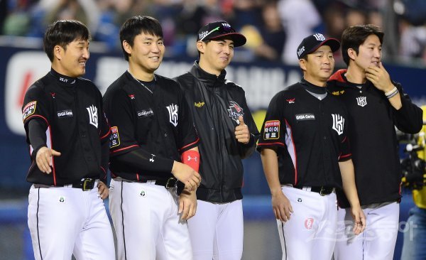 15일 잠실야구장에서 열린 ‘2017 타이어뱅크 KBO 리그’ LG트윈스와 kt위즈의 경기에서 연장 접전 끝에 kt가 1-0 승리를 거뒀다. 경기 후 kt 선수들이 LG 선수들을 향해 미소를 짓고 있다.