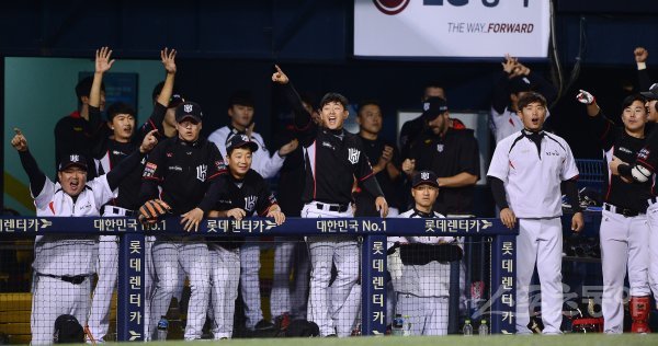 15일 잠실야구장에서 ‘2017 타이어뱅크 KBO 리그’ LG트윈스와 kt위즈의 경기가 열렸다. 10회초 1사 1,3루 상황에서 kt 모넬의 우익수 희생플라이 때 심우준의 득점으로 1-0으로 앞선 kt 더그아웃이 환호하고 있다.