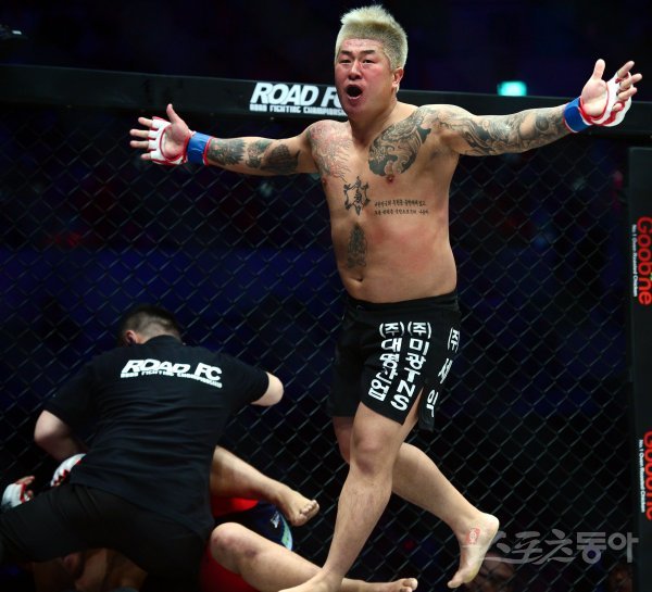 15일 서울 장충체육관에서 ‘로드FC 38’ 경기가 열렸다. -84kg 미들급 쿠와바라 기요시(일본)와 김대성(한국)의 경기에서 김대성이 1라운드 TKO승을 거둔 뒤 환호하고 있다.