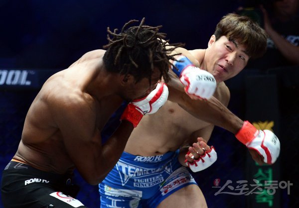 15일 서울 장충체육관에서 ‘로드FC 38’ 경기가 열렸다. -70kg 100만불 토너먼트 예선 B조 만수르 바르나위와 기원빈(한국)의 경기에서 기원빈이 강력한 주먹을 날리고 있다.