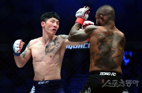 15일 서울 장충체육관에서 ‘로드FC 38’ 경기가 열렸다. -70kg 100만불 토너먼트 예선 B조 브루노 미란다와 난딘에르덴의 경기에서 난딘에르덴이 강력한 주먹을 날리고 있다.