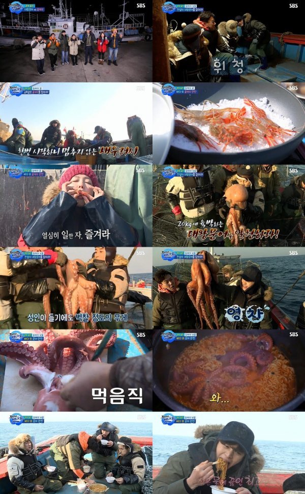 새우배 팀은 꽃새우와 귀한 닭새우를 잡는데 성공, 그 자리에서 새우 회를 맛보는 즐거움을 누렸다. 문어배팀에게도 기쁜 소식이 찾아왔다. 두 손을 꼭 쥐고 문어가 잡히길 바라는 멤버들 앞에 커다란 문어가 연이어 올라온 것. 20kg에 육박하는 대왕문어는 보는 이들의 탄성을 자아냈다. ‘문어 꽤나 봤다’던 김병만도 “그렇게 큰 문어는 처음봤다”며 감탄했다.