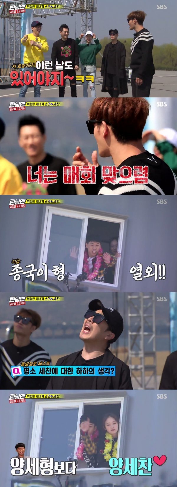 이날 양세찬은 김종국에게 자신들을 대신해 물을 맞아달라고 부탁했다. 이에 김종국은 “나는 물을 맞을 게 너는 매회 매를 맞아라”라고 말해 웃음을 자아냈다. 그러자 양세찬은 겁에 질려 “김종국 형은 열외다”라고 급하게 태세를 전환했다.