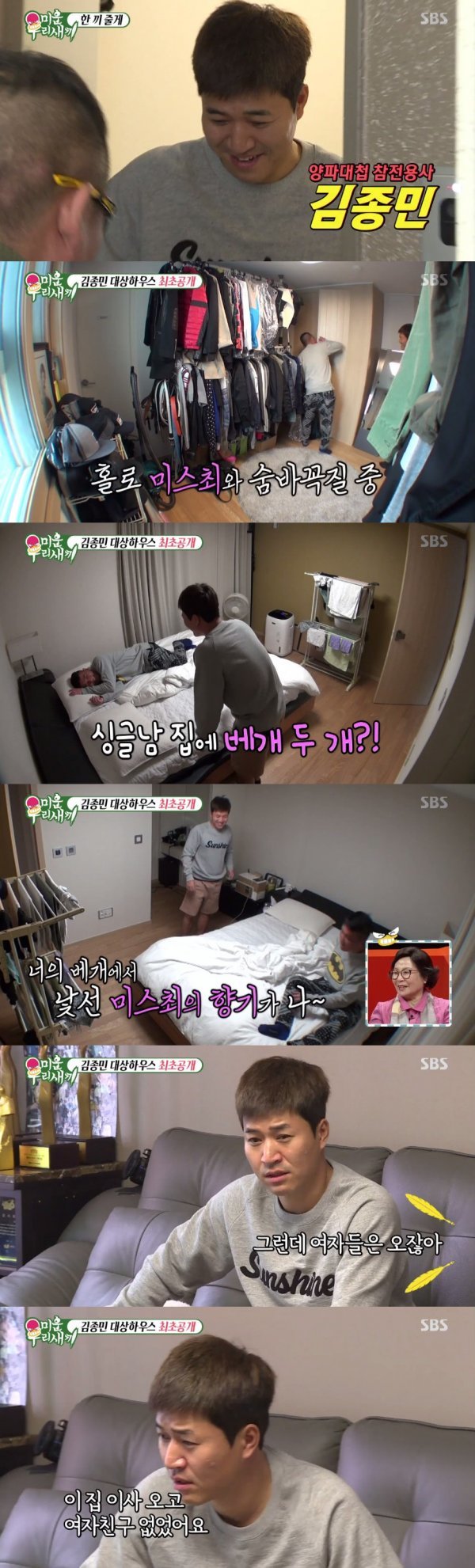 김건모는 “여자의 흔적이 전혀 없다”라고 말하며 “근데 여자들은 오지 않냐”고 물었다. 이에 김종민은 “엄마만 온다. 이 집 오고 나서 여자친구가 없었다”는 고백을 해 눈길을 끌었다.
