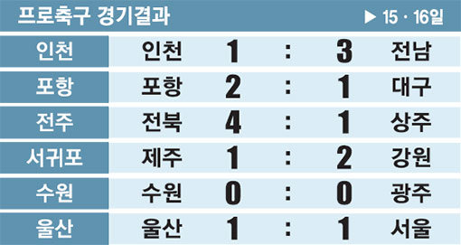 한편 제주 유나이티드는 이날 안방에서 강원FC에 1-2로 덜미를 잡혀 개막 5경기 무패(3승2무) 끝에 첫 패배를 당했다. 울산현대와 FC서울은 1-1로 승부를 가리지 못했다. 수원삼성은 졸전 끝에 광주FC와 0-0으로 비겨 올 시즌 무승행진을 6경기(5무1패)로 늘렸다.