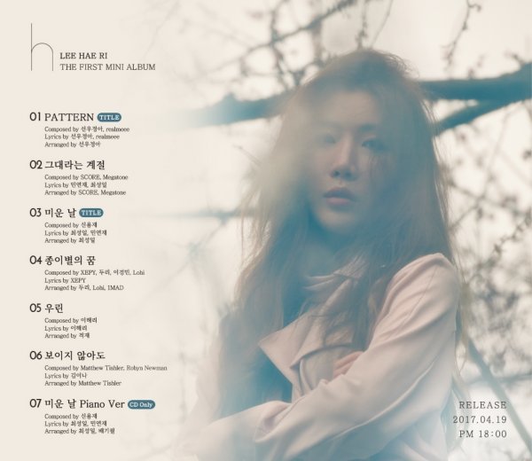 한편, 이해리는 19일 저녁 6시, 타이틀곡 '미운 날'을 포함한 첫 번째 솔로앨범 'h'를 발표하고, 오는 6월 3일과 4일 양일간 서울 마포구 서강대학교 메리홀에서 단독 콘서트 'h'를 갖고 팬들과 만난다.
