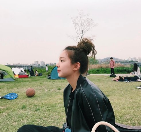 사진 속 이호정은 머리를 올려 묶은 채 잔디밭에 앉아 어딘가를 응시하고 있는 모습이다.