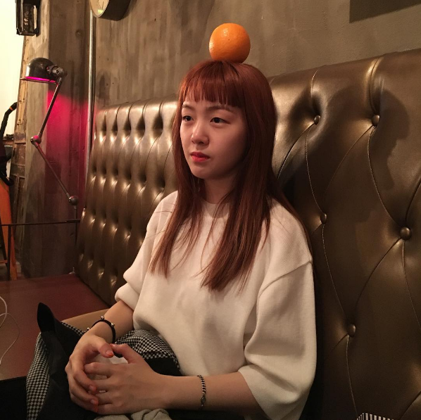 또 다른 사진에서 민아는 화장기 없는 수수한 얼굴로 멍한 표정을 짓고 있다. 머리 위에는 오렌지를 올려놔 엉뚱한 매력을 뽐냈다.