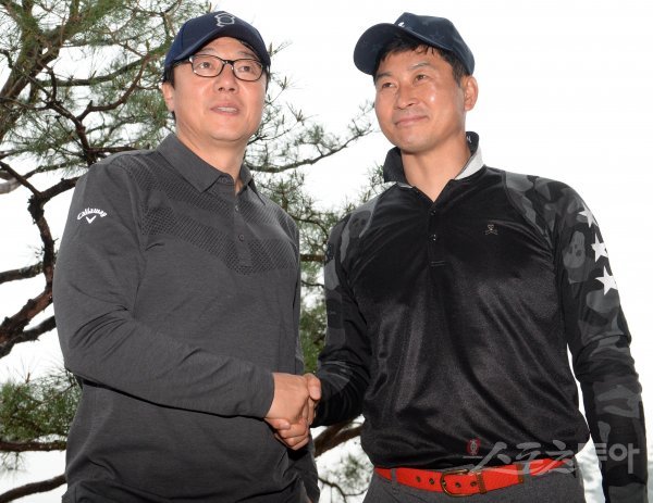 스포츠동아, 스포츠조선, 스포츠경향, 스포츠서울, 스포츠월드, 일간스포츠 등 스포츠전문 미디어 6개사가 후원하는 제4회 축구인 골프대회가 17일 경기도 여주 솔모로CC에서 열렸다. 대회에 참가한 황선홍 FC서울 감독과 김도훈 울산 현대 감독이 악수를 나누고 있다.
