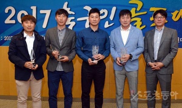 스포츠동아, 스포츠조선, 스포츠경향, 스포츠서울, 스포츠월드, 일간스포츠 등 스포츠전문 미디어 6개사가 후원하는 제4회 축구인 골프대회가 17일 경기도 여주 솔모로CC에서 열렸다. 김기동(2위), 김상식(3위), 김도훈(메달리스트), 정성천(우승), 황선홍(롱기스트)이 기념촬영을 하고 있다.