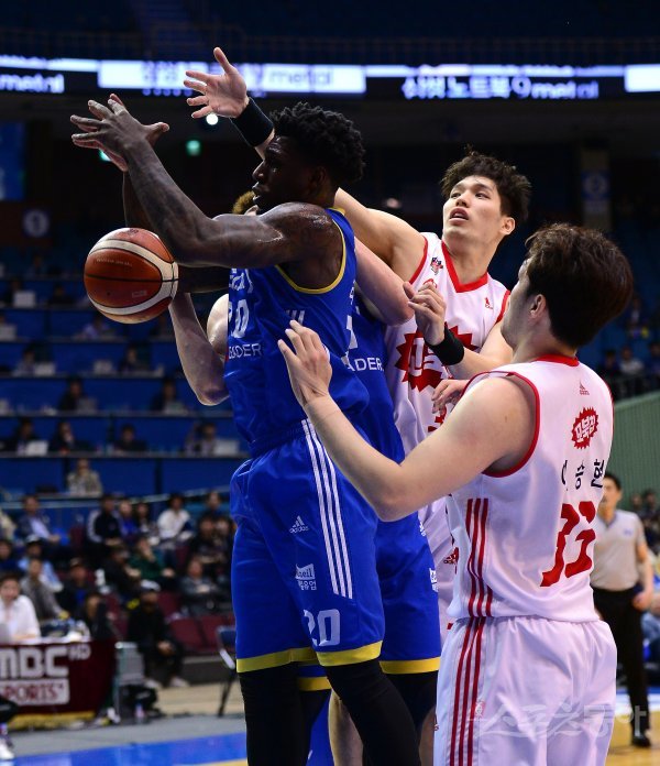 17일 서울 잠실실내체육관에서 열린 ‘2016~2017 KCC 프로농구’ 4강 플레이오프 4차전 오리온과 삼성의 경기에서 삼성 라틀리프와 오리온 장재석이 리바운드 볼을 다투고 있다.