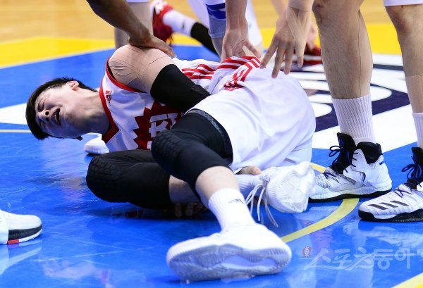17일 서울 잠실실내체육관에서 열린 ‘2016~2017 KCC 프로농구’ 4강 플레이오프 4차전 오리온과 삼성의 경기에서 오리온 최진수가 부상을 당해 고통스러워 하고 있다.