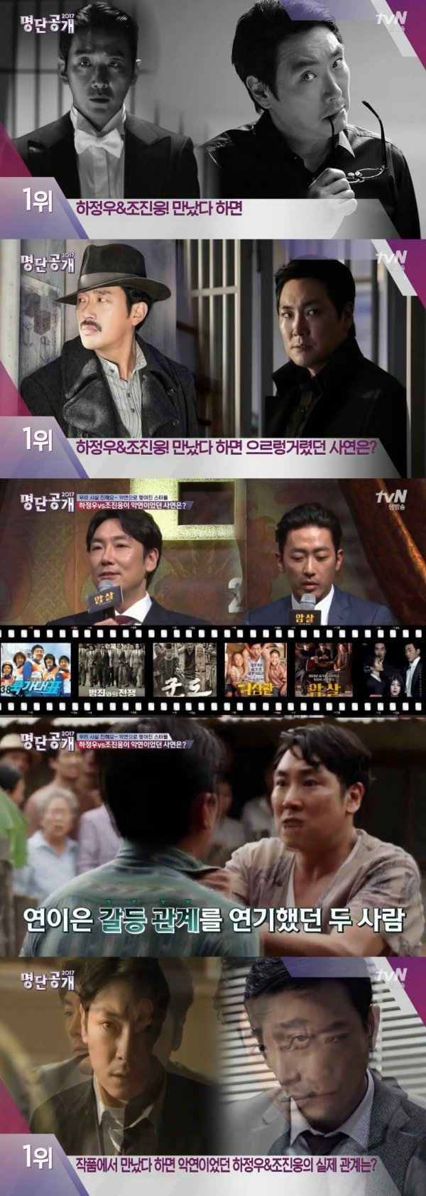 17일 오후 방송된 tvN 프로그램 ‘명단공개’에서는 악연으로 맺어진 스타들이라는 주제로 하정우와 조진웅의 특별한 우정에 대한 이야기가 그려졌다.