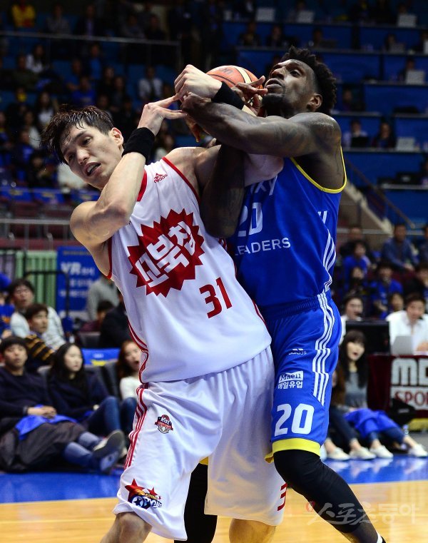 17일 서울 잠실실내체육관에서 열린 ‘2016~2017 KCC 프로농구’ 4강 플레이오프 4차전 오리온과 삼성의 경기에서 삼성 라틀리프와 오리온 장재석이 리바운드 볼을 다투고 있다.