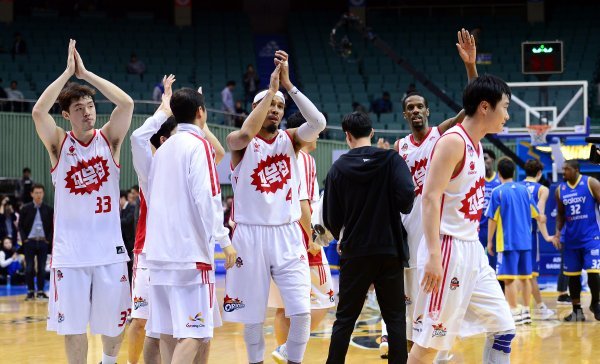 17일 서울 잠실실내체육관에서 열린 ‘2016~2017 KCC 프로농구’ 4강 플레이오프 4차전 오리온과 삼성의 경기에서 79-76 승리를 거두며 승부를 원점으로 돌린 오리온 선수들이 기뻐하고 있다.