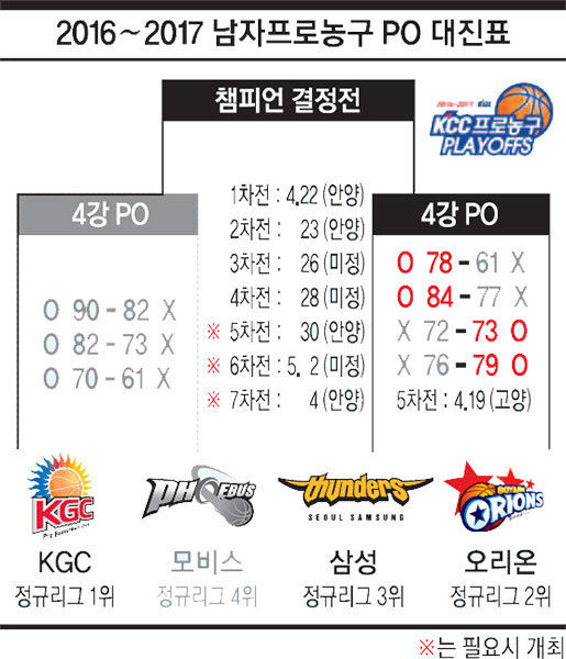 오리온은 17일 잠실체육관에서 열린 삼성과의 ‘2016∼2017 KCC 프로농구’ 4강 플레이오프(PO·5전3승제) 4차전에서 애런 헤인즈(26점·10리바운드·8어시스트)-이승현(19점)의 맹활약을 앞세워 79-76으로 이겼다. 오리온은 홈 1·2차전을 모두 내준 뒤 원정 3·4차전에서 모두 승리해 19일 안방에서 최종 5차전을 치르게 됐다.