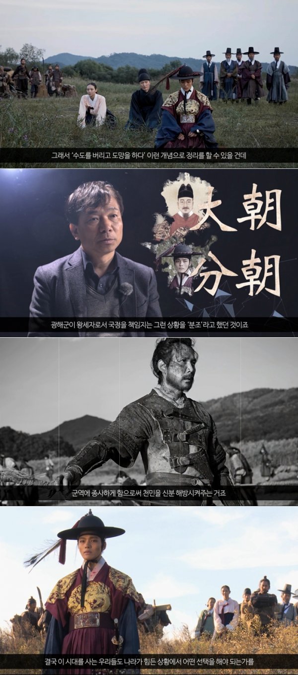 먼저 첫 번째 키워드 ’파천’은 ‘도망하다, 버리다’의 뜻과 ‘옮기다’라는 뜻으로 역사상 가장 혼란스러웠던 시기인 임진왜란 당시, 조선을 버리고 명나라로의 피란을 택한 선조 그리고 광해를 왕세자로 삼게 된 이유를 확인할 수 있다. 다음으로 두 번째 키워드 ‘분조’는 ‘조정을 둘로 나누다’라는 뜻으로 위기의 전란 속 나라를 둘로 나누게 된 영화 속 역사적 배경을 설명하며 흥미를 배가시킨다. 또한 선조 대신 왜군에 맞서 분조를 이끌게 된 광해와 대립군 일행의 운명적 만남에 대해 다채롭게 설명하며 호기심을 자극한다. 특히 지금껏 한번도 조명된 적 없었던 영화 속 핵심 키워드 ‘대립군’에 대한 이야기와 더불어 조선에서 가장 높은 신분에 속하는 왕과 가장 낮은 신분에 속하는 대립군, 이들이 여정을 함께 할 수 밖에 없었던 역사적 사실을 흥미롭게 풀어주며 영화에 대한 기대감을 증폭시킨다.