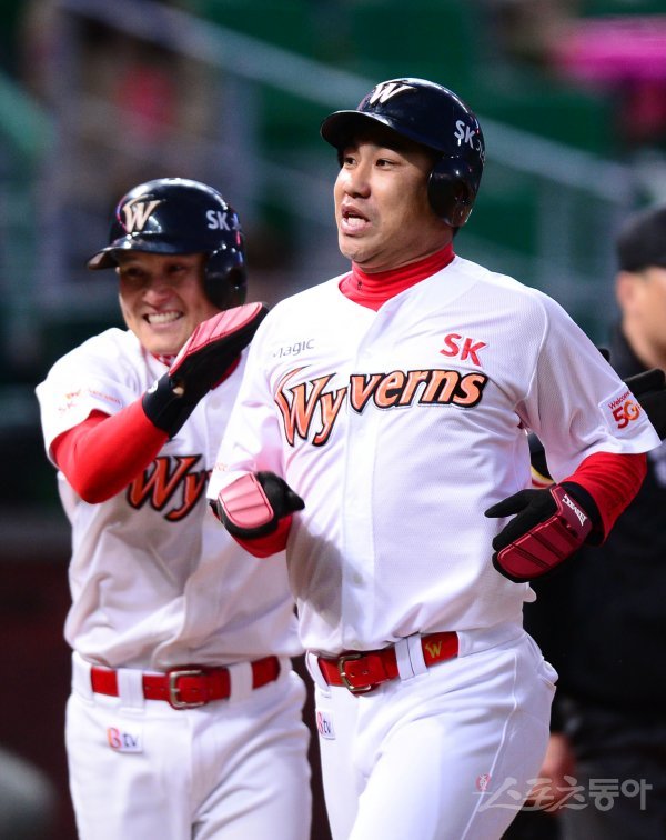 18일 인천 SK행복드림구장에서 ‘2017 타이어뱅크 KBO리그’ SK 와이번스와 넥센 히어로즈의 경기가 열렸다. 3회말 무사 2, 3루에서 SK 박정권의 2타점 적시타 때 득점에 성공한 이대수, 김강민이 기쁨을 나누고 있다.