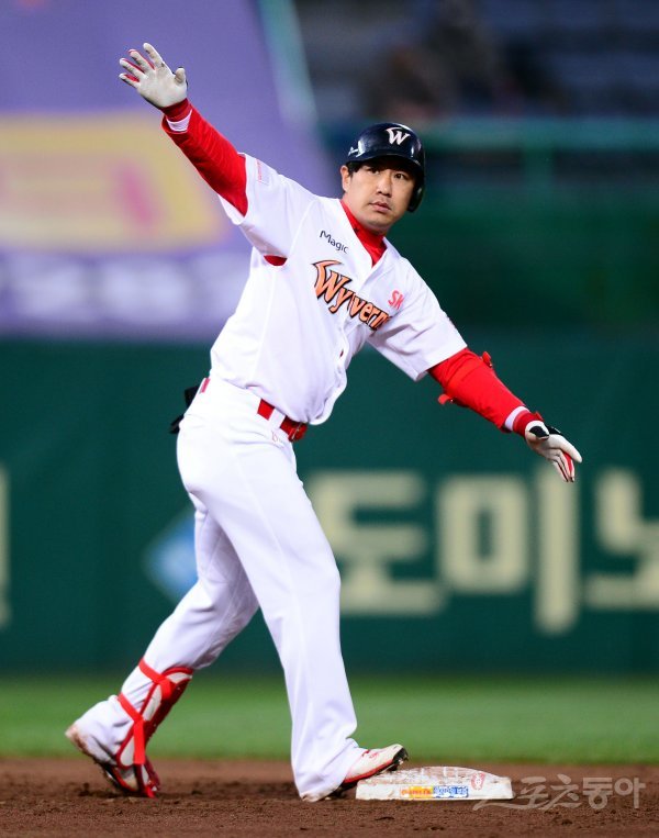 18일 인천 SK행복드림구장에서 ‘2017 타이어뱅크 KBO리그’ SK 와이번스와 넥센 히어로즈의 경기가 열렸다. 3회말 무사 1, 3루에서 SK 김강민이 1타점 2루타를 치고난 뒤 타임을 요청하고 있다.