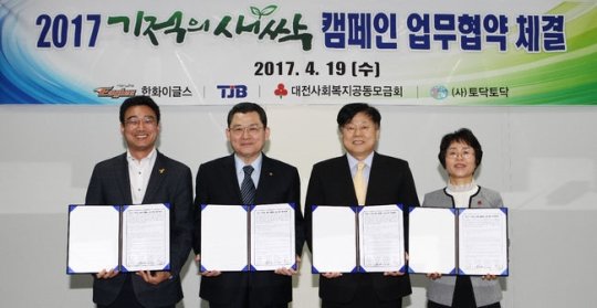 프로야구 한화이글스가 어린이재활병원 건립 기금 마련을 위한 '2017 기적의 새싹 캠페인' 진행을 위해 19일 사단법인 토닥토닥, 사회복지공동모금회, TJB 대전방송 등과 업무협약을 체결했다.