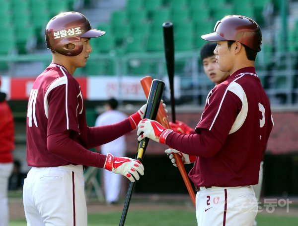 19일 인천 SK행복드림구장에서 ‘2017 타이어뱅크 KBO리그’ SK 와이번스와 넥센 히어로즈의 경기가 열린다. 경기전 넥센 이정후(2017년 1차)와 주효상(2016년 1차)이 배트를 교환하고 있다.