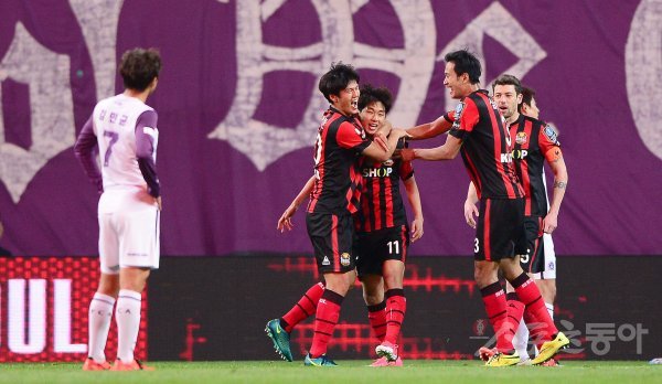 19일 서울월드컵경기장에서 2017 KEB하나은행 FA컵 32강전 FC서울과 안양FC의 경기가 열렸다. 전반 팀의 두 번째 골을 넣은 FC서울 윤일록(왼쪽 세 번째)이 동료들과 기쁨을 나누고 있다.
