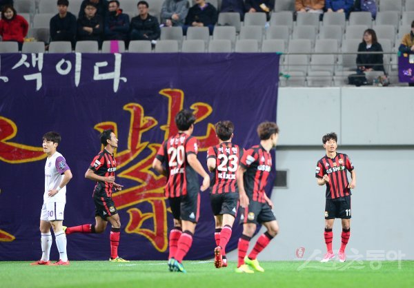 19일 서울월드컵경기장에서 2017 KEB하나은행 FA컵 32강전 FC서울과 안양FC의 경기가 열렸다. 전반 선취골을 넣은 FC서울 윤일록(오른쪽)이 환호하고 있다.