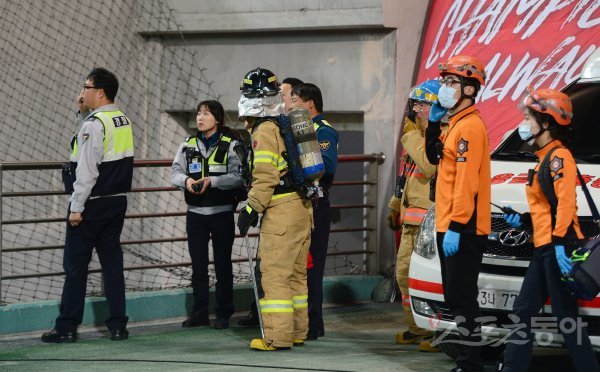 홍염 응원에 긴장하는 경찰과 소방대원들