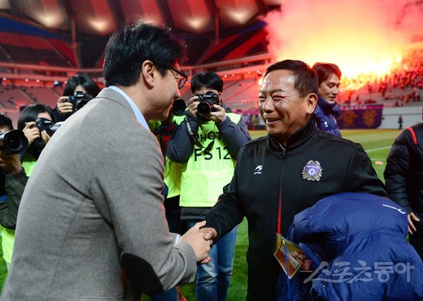 19일 서울월드컵경기장에서 2017 KEB하나은행 FA컵 32강전 FC서울과 안양FC의 경기가 열렸다. 안양FC 김종필 감독이 FC서울 황선홍 감독(왼쪽)과 악수를 나누고 있다.