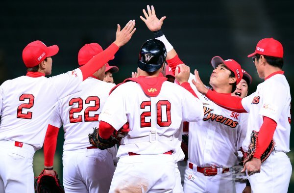 19일 인천 SK행복드림구장에서 ‘2017 타이어뱅크 KBO리그’ SK 와이번스와 넥센 히어로즈의 경기가 열렸다. SK가 넥센에 5-3으로 승리하며 7연승을 기록한 뒤 선수들이 그라운드에서 기쁨을 나누고 있다.