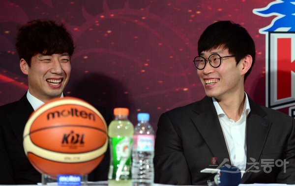 20일 서울 논현동 KBL센터에서 ‘2016-2017 KCC 프로농구’ 안양 KGC인삼공사와 서울 삼성의 챔피언결정전에 앞서 미디어데이가 열렸다. KGC 양희종과 오세근이 삼성 주희정의 인터뷰 공격 때 미소를 짓고 있다.