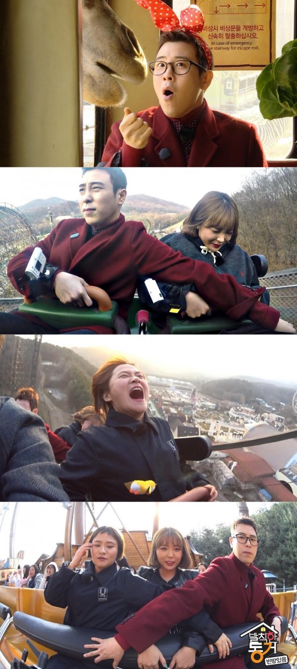 또한 먹이를 먹는 기린의 모습에 깜짝 놀란 귀여운 피오의 모습과 함께 홀로 롤러코스터에 탄 큰 누나 김신영이 세차게 부는 바람을 온 얼굴로 받아내는 모습까지 공개돼 보는 이들을 폭소케 만들고 있다.