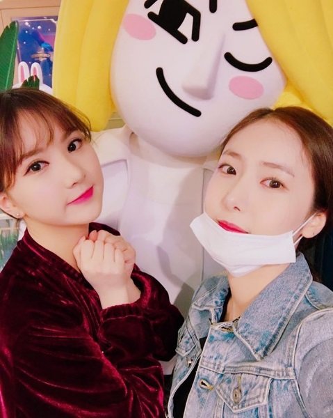 사진 속 은하와 신비는 캐릭터 인형을 사이에 두고 귀여운 표정을 짓고 있다. 인형에게 인사를 하고, 팔짱을 끼는 등 풋풋한 20대 소녀들의 모습을 보여주고 있다.